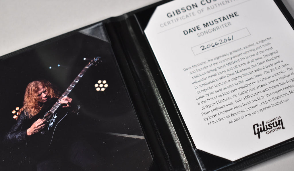 Dave Mustaine, the legendary guitarist, vocalist, songwriter, and founder of the Grammy-award winning and multi-platinum-selling band MEGADETH is one of the most influential metal icons and riff lords of all time. His music has inspired multiple generations of players around the world. Gibson is proud to introduce the Dave Mustaine Songwriter. Designed in collaboration with Gibson brand ambassador Dave Mustaine, it features a slightly thinner walnut Songwriter body for playing comfort with a cutaway for easy access to the upper frets, a 24.75" scale mahogany neck with a 24 fret ebony fretboard (the first 24 fret neck ever installed on a Gibson acoustic guitar), mother of pearl teeth inlays, Grover® Rotomatic tuners, a TUSQ® nut, saddle, bridge pins, and a higher output LR Baggs™ VTC under-saddle pickup with soundhole mounted volume and tone controls. Vic Rattlehead artwork is featured on the pickguard and on a mother of pearl peghead inlay. A Gibson hardshell case is included.