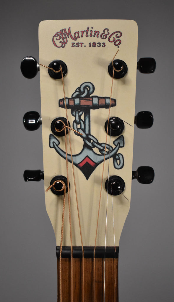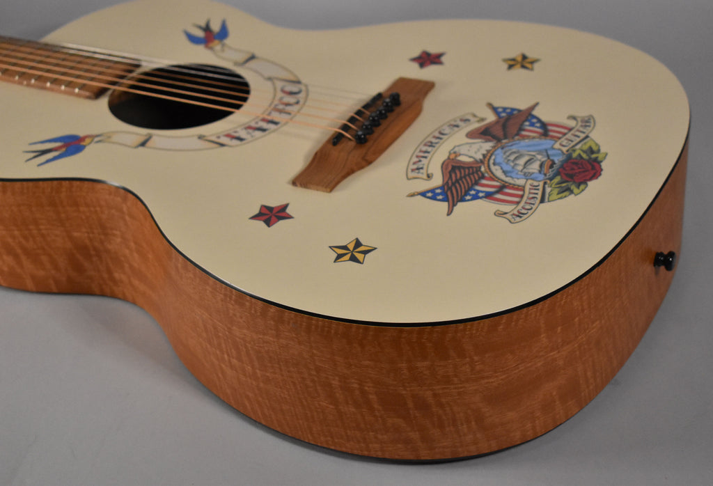 A task team was formed at Martin to create a guitar inspired by traditional American "Tattoo" art, hence the Limited Edition Tattoo model that features "tawny satinwood" HPL back and sides, an HPL top with imprinted graphics created by Robert Armstrong, and a natural Stratabond neck. Each guitar is furnished with a special dark brown leatherette case with traditionally embossed faux leather tooling and mauve plush interior. In addition, a tattoo themed strap specially made by Jodi Head Custom Guitar Straps accompanies each instrument. Hurry and get yours now, Martin Limited Editions don't hang around for very long. Martin Tattoo Features: